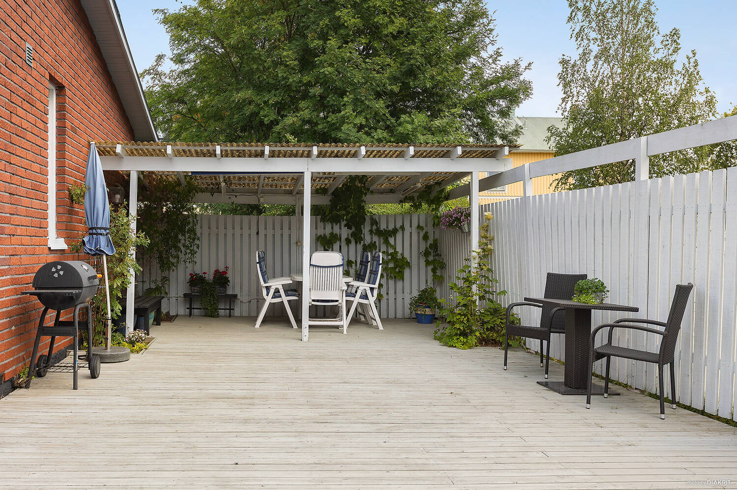 Utemiljön - Här väntar en rymlig altan delvis under tak med plats för både solstol, middagsbjudningar och en bubbelpool som förvandlar sommarkvällar till ren magi. Trädgården är en grön oas för både lek, vila och njutning.