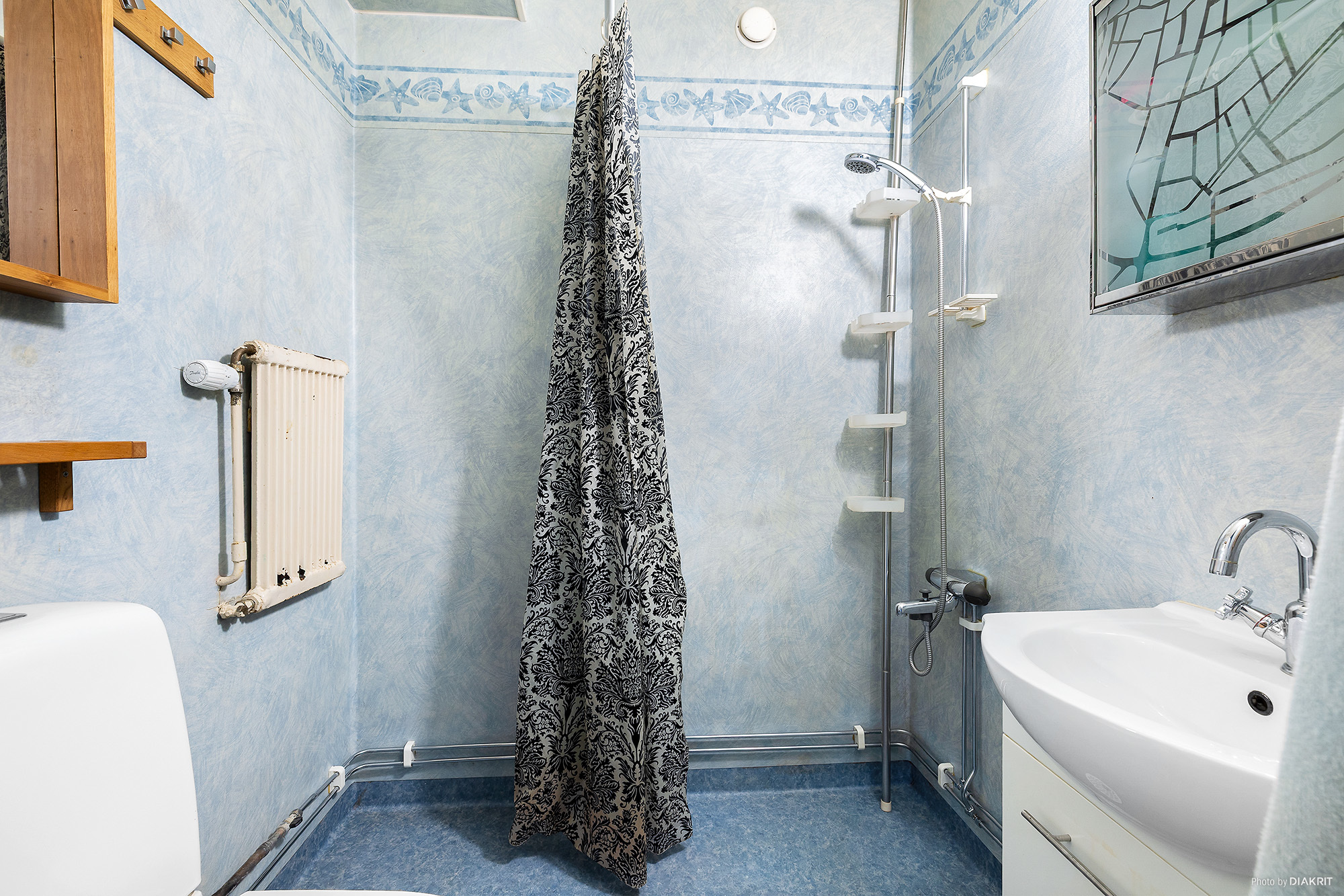 Badrum med våtrumsmatta på golvet och väggarna. Handfat med underskåp, väggskåp med spegel, duschplats.