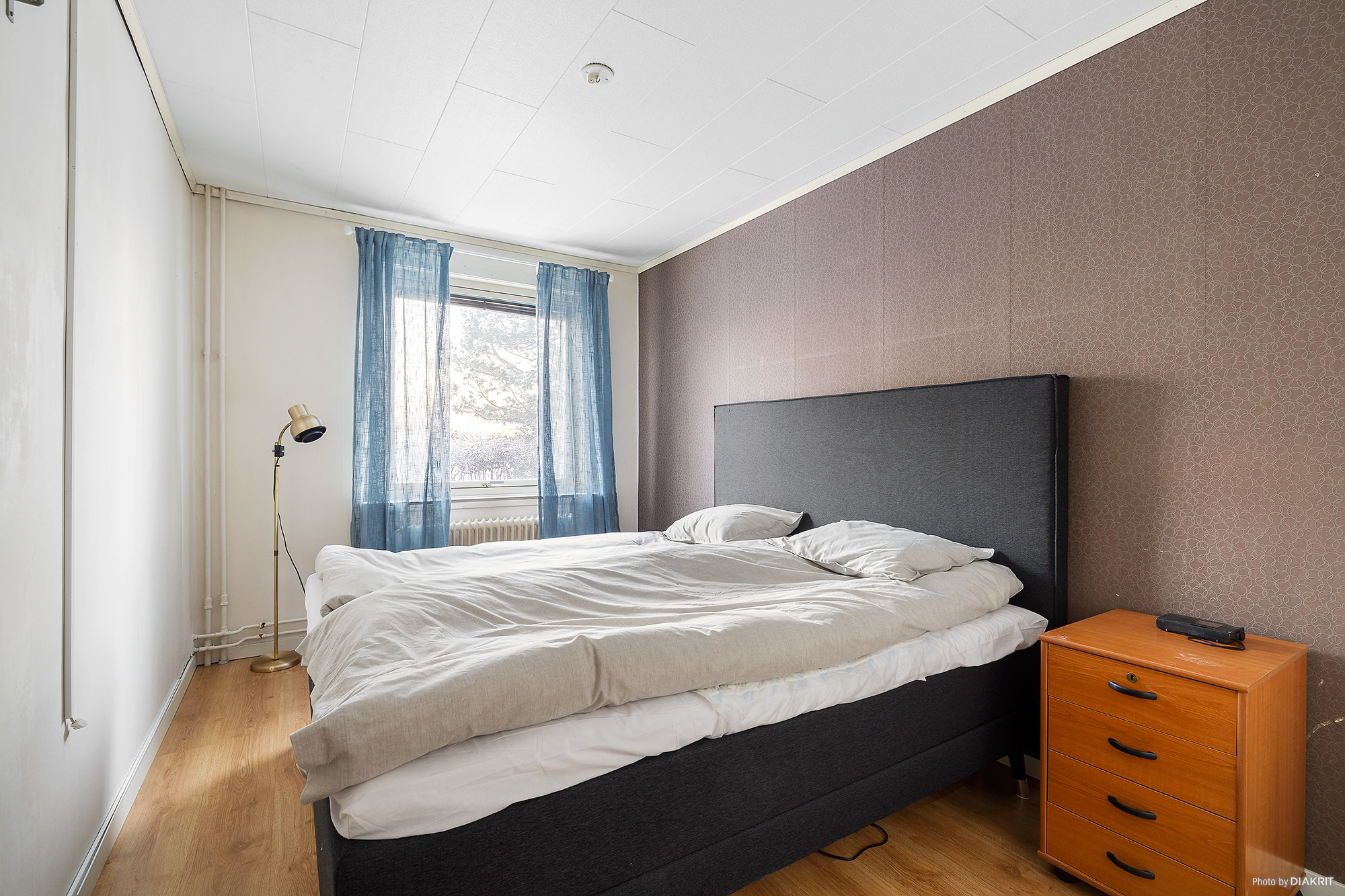Sovrum med fint golv, ljusa väggar och mörk fondvägg. Här finns plats för dubbelsäng och sängbord.