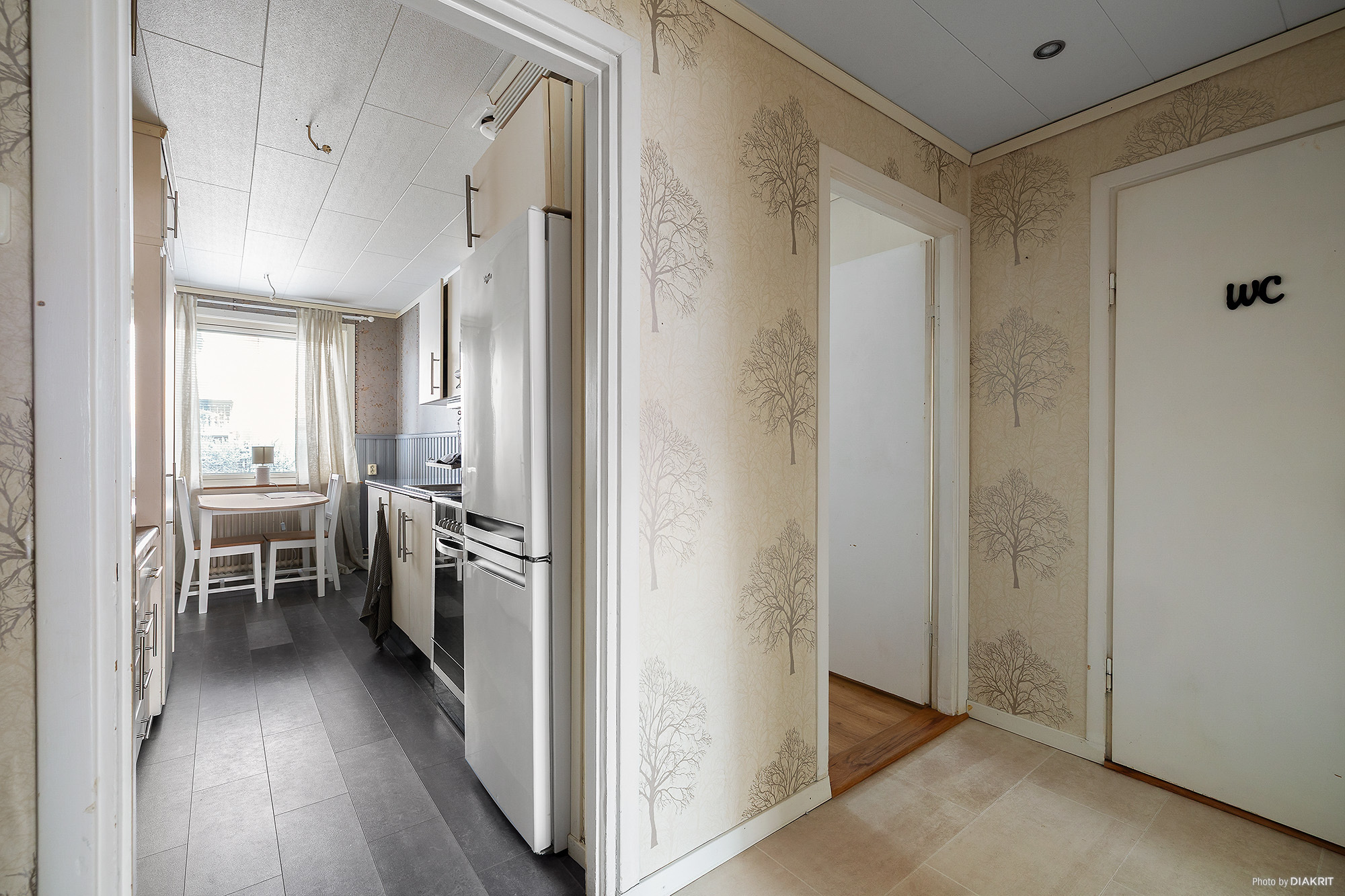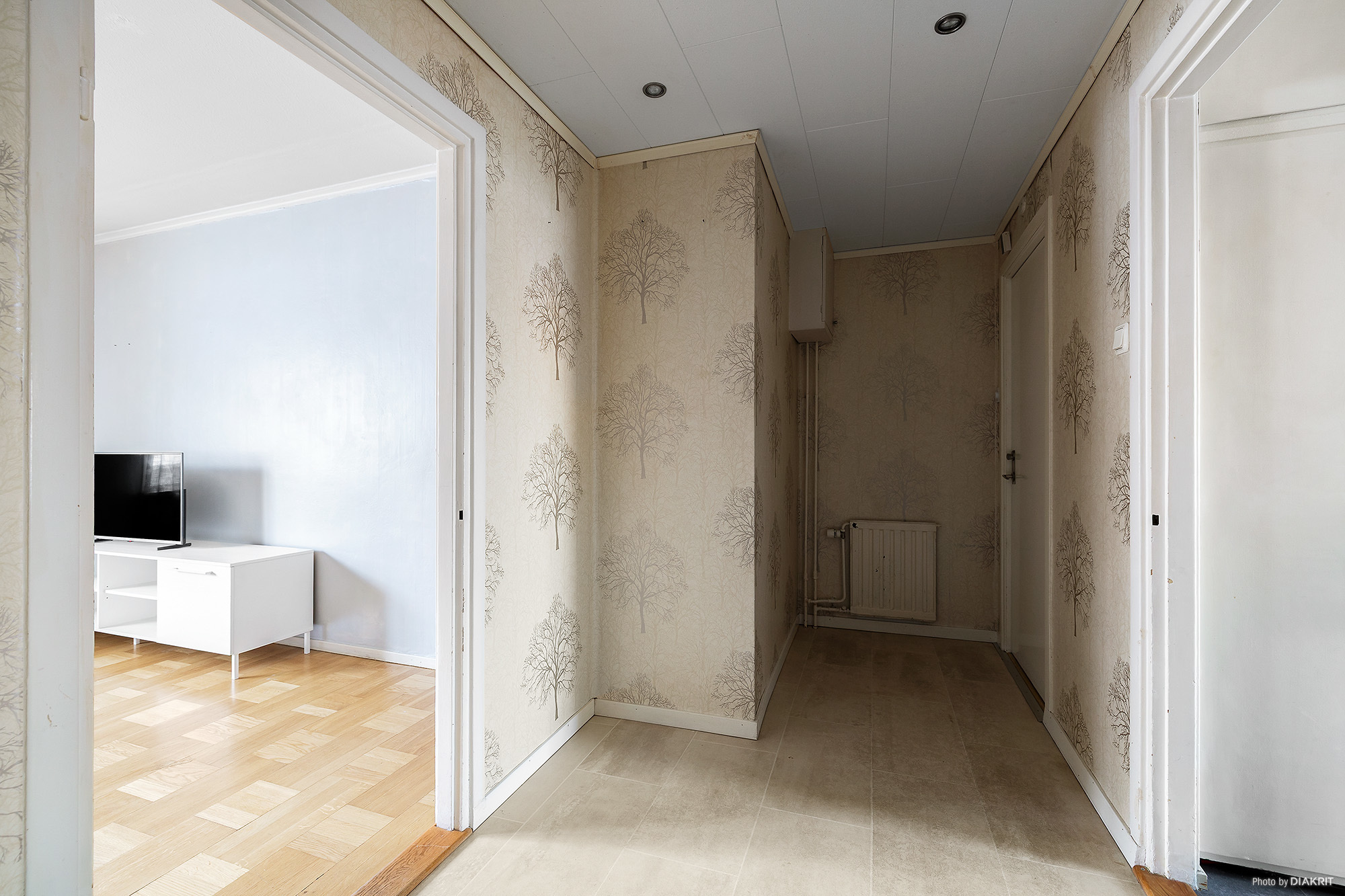 Entré med välkomnande hall. Ljust golv, infällda spotlights i innertaket och ljus mönstrad tapet. Från hallen när man lägenhetens alla rum.