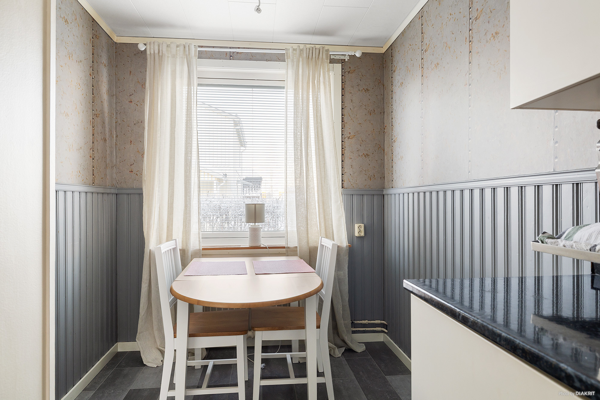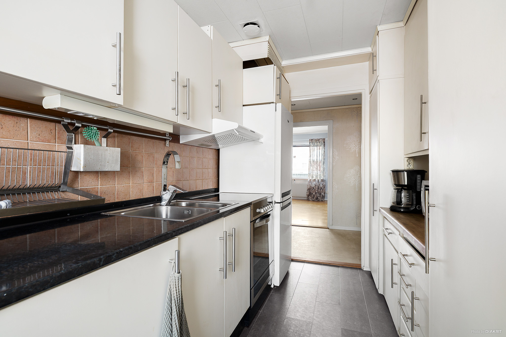 Kök med matplats. Ljusa köksluckor och rostfria handtag, laminatbänkskiva med infälld diskho och kakel som stänkskydd. Den maskinella utrustningen består av spis med häll, spisfläkt, kyl/frys.