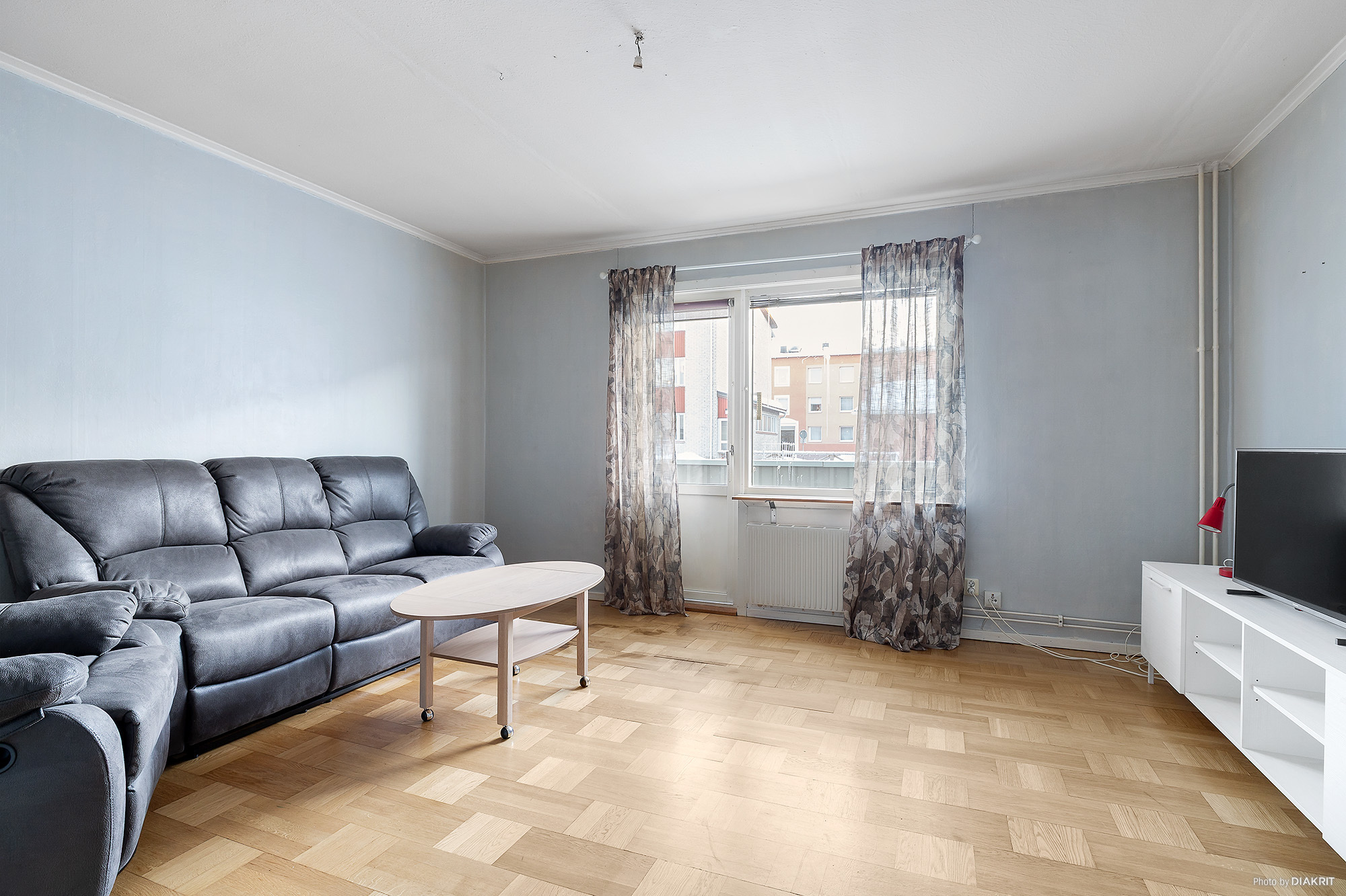 Ljust och trivsamt vardagsrum med gott om plats för soffgrupp och tv-vägg. Parkettgolv och tapetsrade väggar. Utgång till lägenhetens balkong.